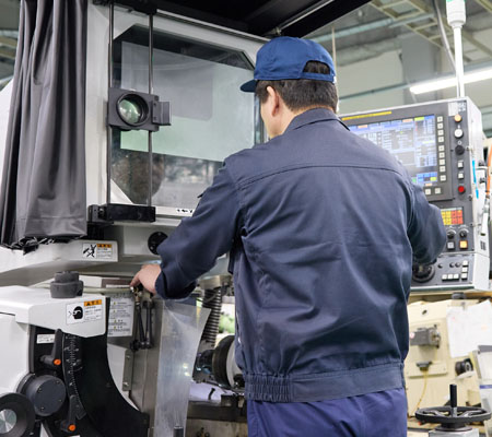 予め設定した形状を拡大して投影し、高精度が要求される加工を倣い研削によって行うのがプロファイル加工。この工程を、入社以来35年にわたって担当しています。現在は3人のチームのヘッドとして、また課を統括する課長として主にマネジメントを行い、ゆるぎない品質管理、確実な納期管理などを遂行しています。