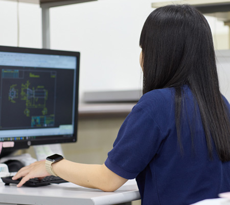 製造部がつくる製品の設計図やお客様に提示する承認図を製作しています。通常は、営業との打ち合わせで提供される資料や手書きのラフ図、これまでの事例などをもとに製作すべき設計図を把握。CADを使って作図していきます。CADは入社してから習得した技術。線の引き方から先輩に教えていただきました。